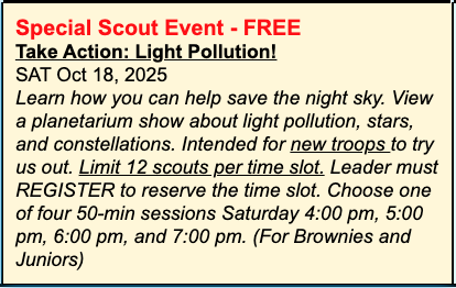 Scout Leaders only: You may reserve this FREE time block by "registering" for the event. Up to 12 scouts may attend this event.